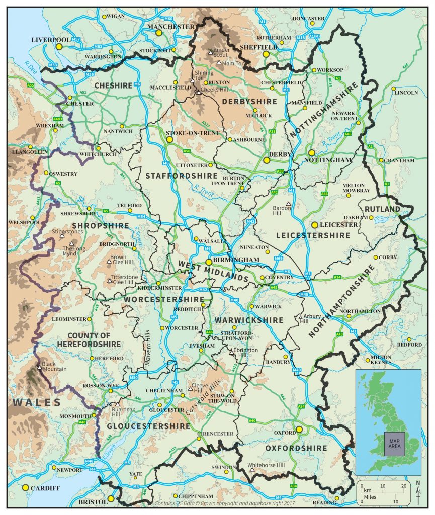 The English Midlands, as defined for the purposes of this book, extend from the Welsh border in the west, northwards to the boundary of Derbyshire and Yorkshire, across to the eastern margin of Northamptonshire and southwards, roughly to the line of the M4 motorway. Included, are the counties of Cheshire, Derbyshire, Gloucestershire, Herefordshire, Leicestershire, Northamptonshire, Nottinghamshire, Oxfordshire, Rutland, Shropshire, Staffordshire, Warwickshire, West Midlands and Worcestershire, a total area of some 30,000 square kilometres (11,600 square miles). It is an area of diverse geology, varied landscape and steeped in industrial history.